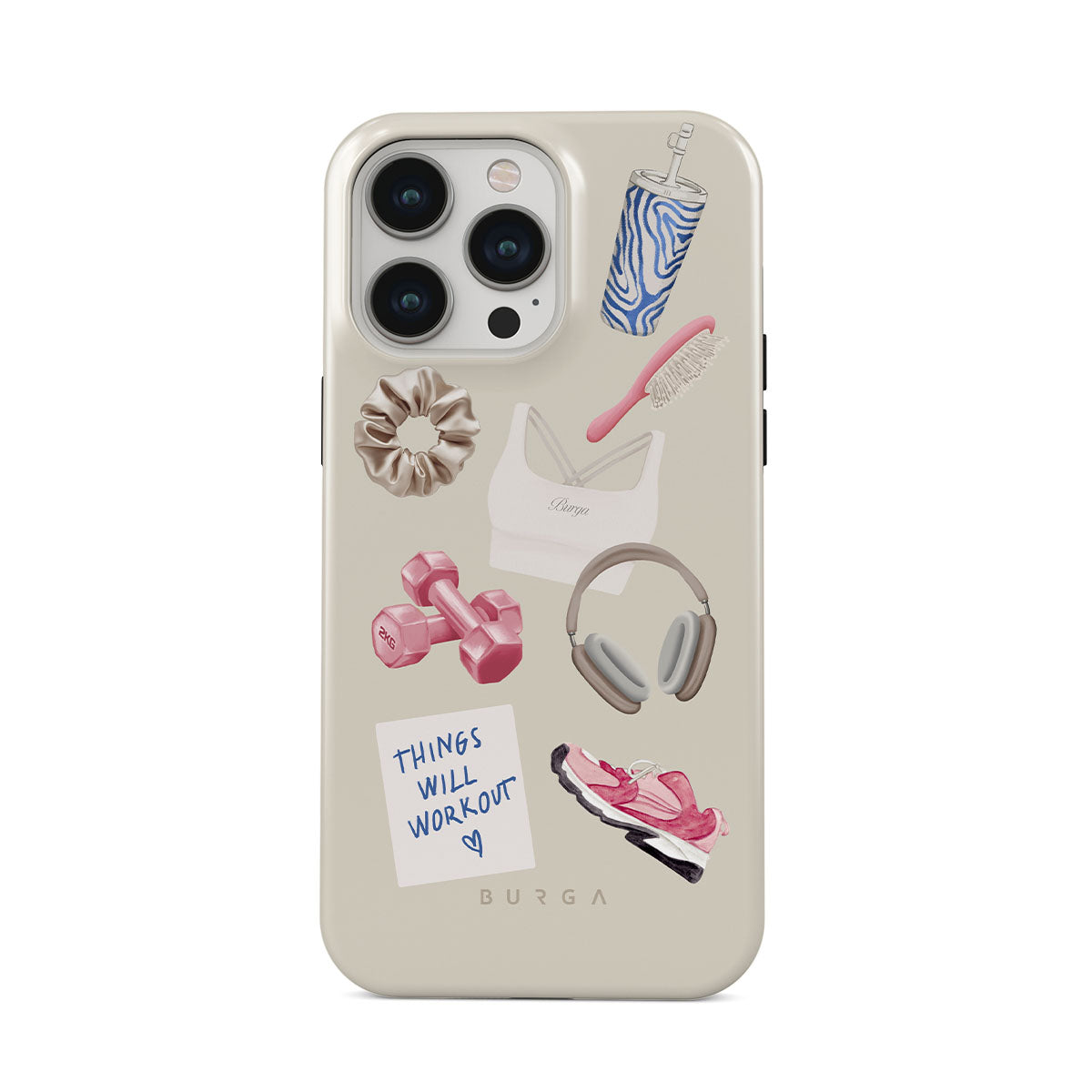 Questo design include: manubri, cuffie, borraccia, spazzola per capelli, scarpe da ginnastica rosa, top sportivo, barretta Crunchie, post-it "Things Will Work Out".
