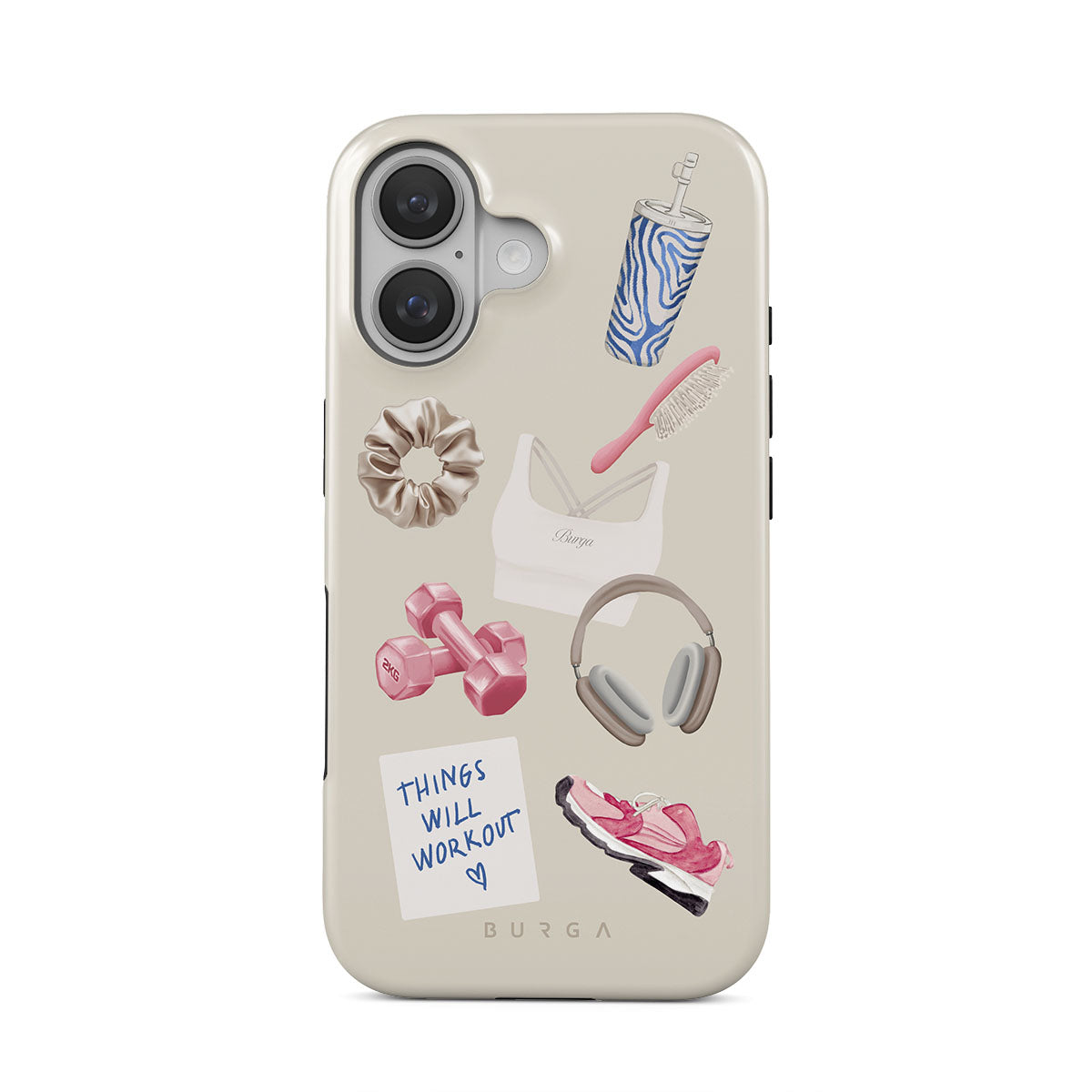 Questo design include: manubri, cuffie, borraccia, spazzola per capelli, scarpe da ginnastica rosa, top sportivo, barretta Crunchie, post-it "Things Will Work Out".