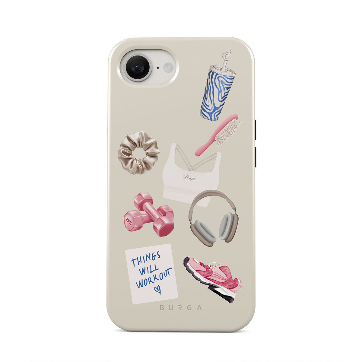Questo design include: manubri, cuffie, borraccia, spazzola per capelli, scarpe da ginnastica rosa, top sportivo, barretta Crunchie, post-it "Things Will Work Out".