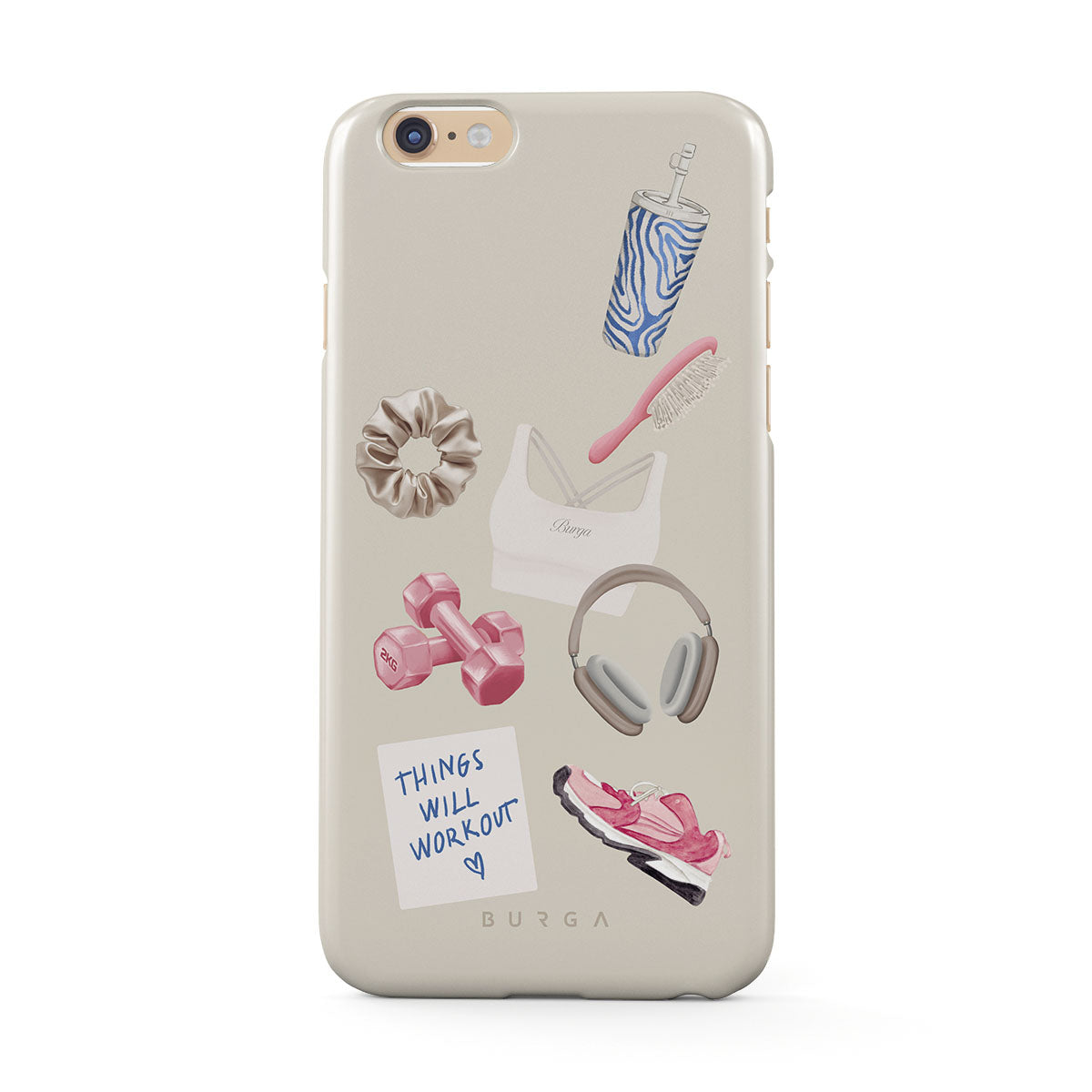 Questo design include: manubri, cuffie, borraccia, spazzola per capelli, scarpe da ginnastica rosa, top sportivo, barretta Crunchie, post-it "Things Will Work Out".