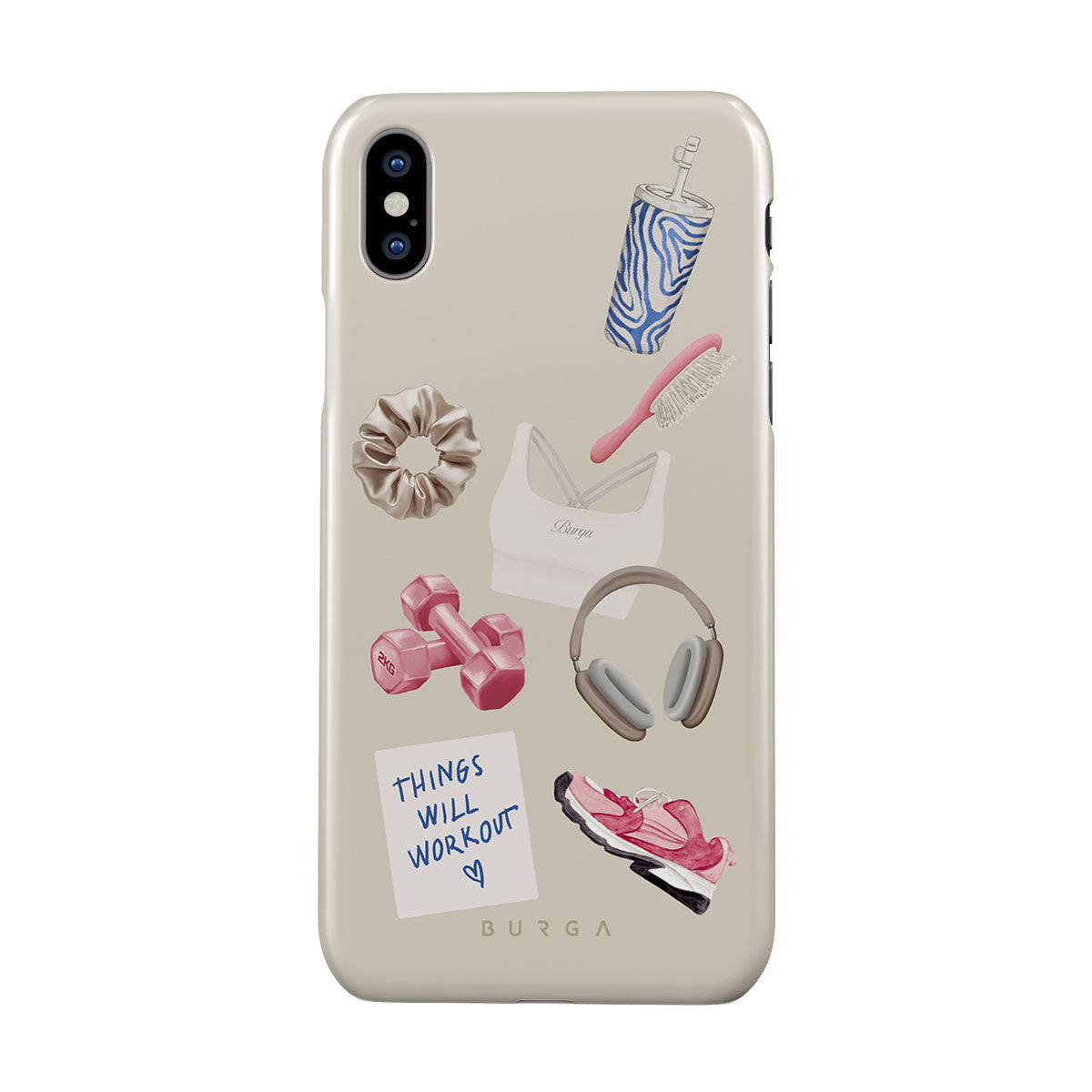 Questo design include: manubri, cuffie, borraccia, spazzola per capelli, scarpe da ginnastica rosa, top sportivo, barretta Crunchie, post-it "Things Will Work Out".
