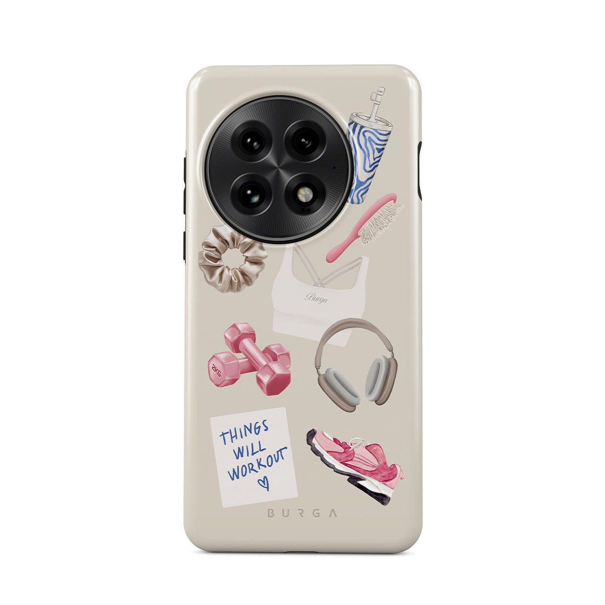 Questo design include: manubri, cuffie, borraccia, spazzola per capelli, scarpe da ginnastica rosa, top sportivo, barretta Crunchie, post-it "Things Will Work Out".