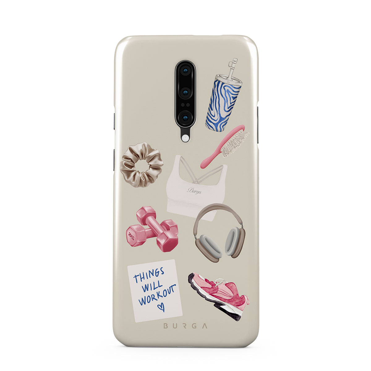Questo design include: manubri, cuffie, borraccia, spazzola per capelli, scarpe da ginnastica rosa, top sportivo, barretta Crunchie, post-it "Things Will Work Out".
