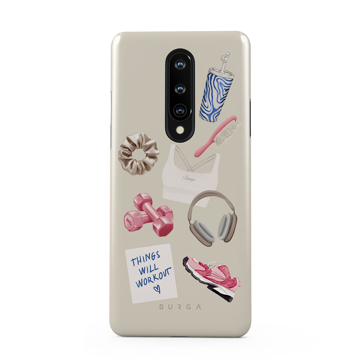 Questo design include: manubri, cuffie, borraccia, spazzola per capelli, scarpe da ginnastica rosa, top sportivo, barretta Crunchie, post-it "Things Will Work Out".