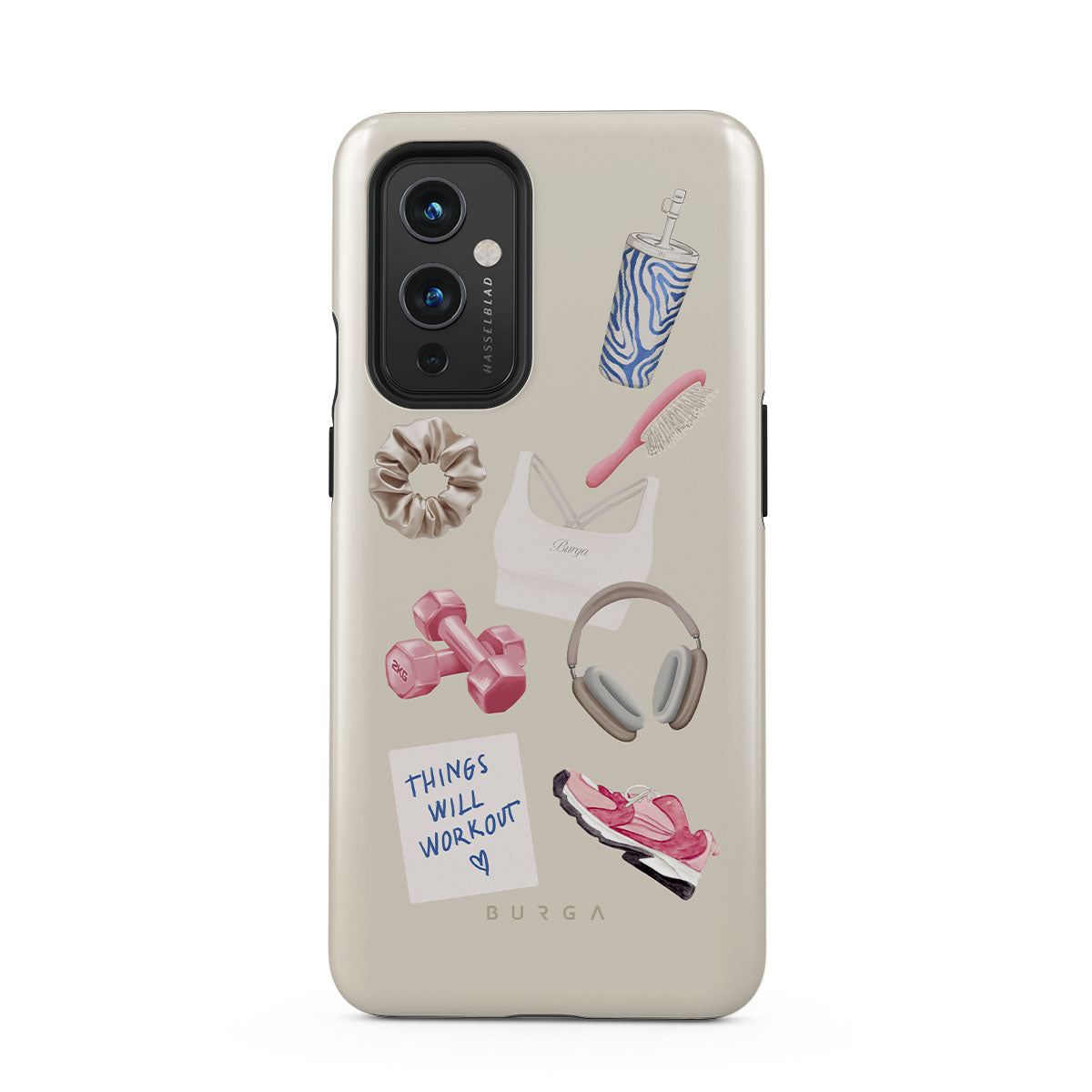 Questo design include: manubri, cuffie, borraccia, spazzola per capelli, scarpe da ginnastica rosa, top sportivo, barretta Crunchie, post-it "Things Will Work Out".