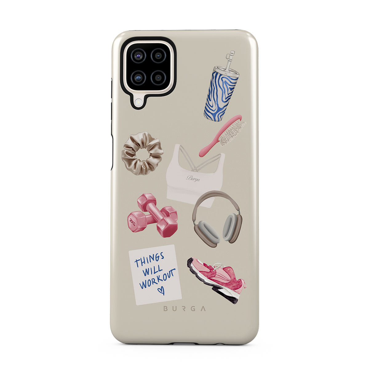 Questo design include: manubri, cuffie, borraccia, spazzola per capelli, scarpe da ginnastica rosa, top sportivo, barretta Crunchie, post-it "Things Will Work Out".