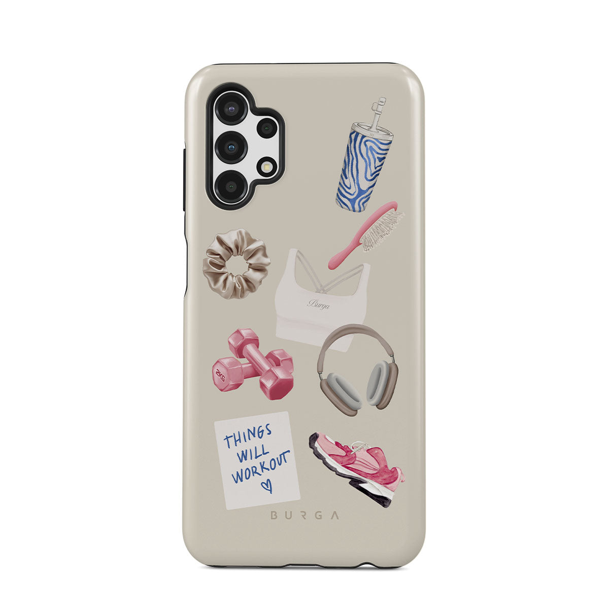 Questo design include: manubri, cuffie, borraccia, spazzola per capelli, scarpe da ginnastica rosa, top sportivo, barretta Crunchie, post-it "Things Will Work Out".