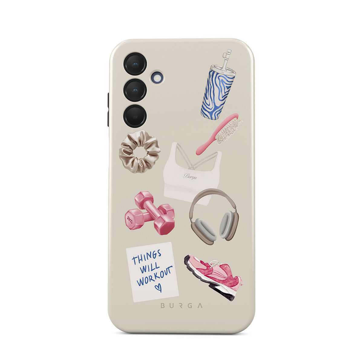Questo design include: manubri, cuffie, borraccia, spazzola per capelli, scarpe da ginnastica rosa, top sportivo, barretta Crunchie, post-it "Things Will Work Out".