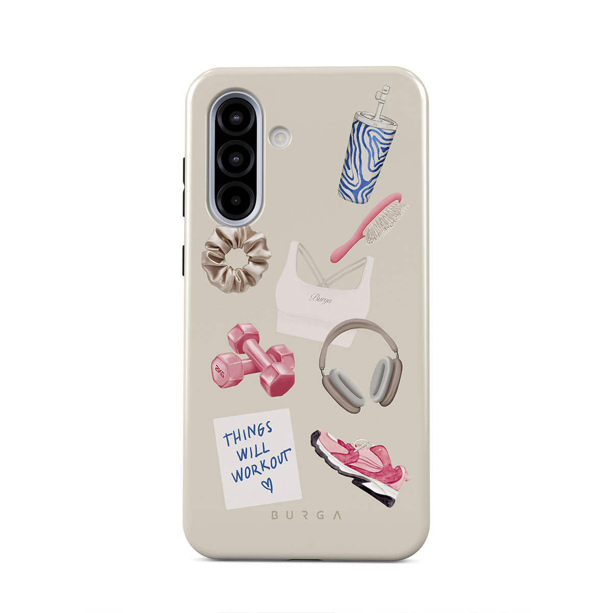Questo design include: manubri, cuffie, borraccia, spazzola per capelli, scarpe da ginnastica rosa, top sportivo, barretta Crunchie, post-it "Things Will Work Out".