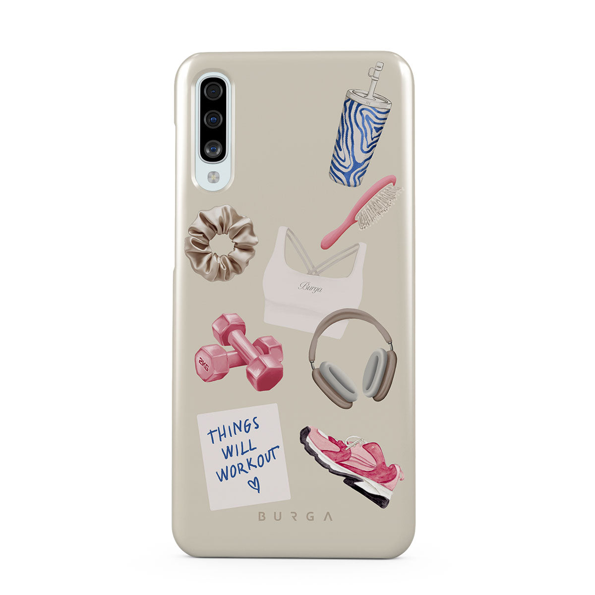 Questo design include: manubri, cuffie, borraccia, spazzola per capelli, scarpe da ginnastica rosa, top sportivo, barretta Crunchie, post-it "Things Will Work Out".