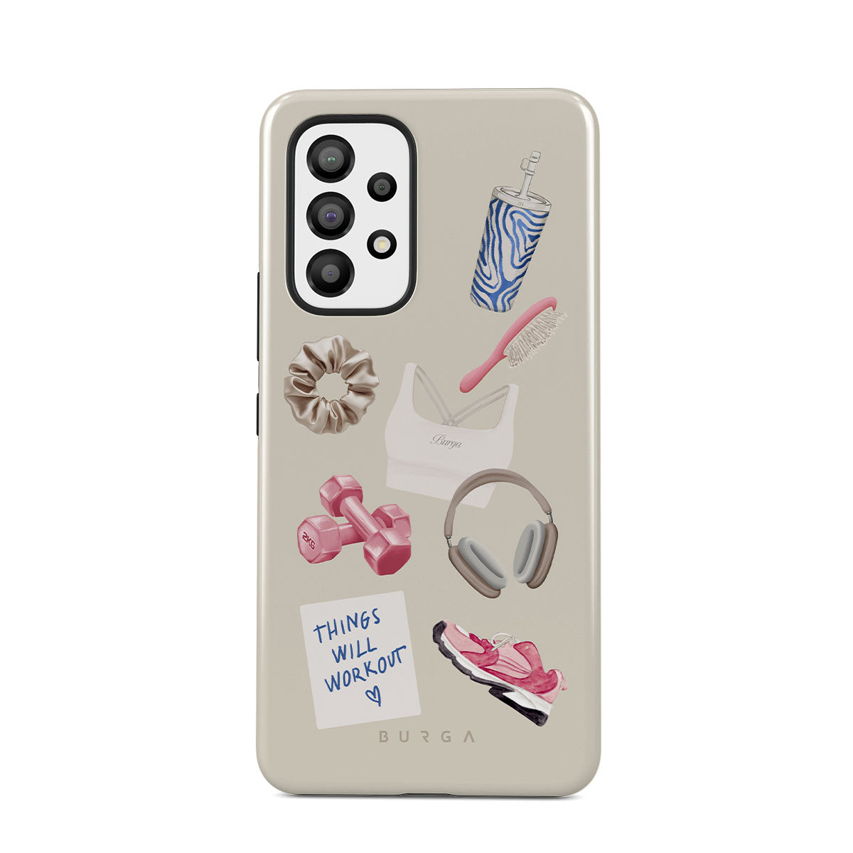 Questo design include: manubri, cuffie, borraccia, spazzola per capelli, scarpe da ginnastica rosa, top sportivo, barretta Crunchie, post-it "Things Will Work Out".