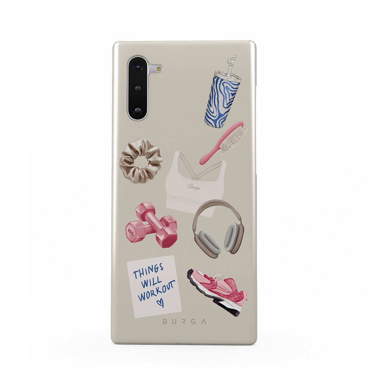 Questo design include: manubri, cuffie, borraccia, spazzola per capelli, scarpe da ginnastica rosa, top sportivo, barretta Crunchie, post-it "Things Will Work Out".