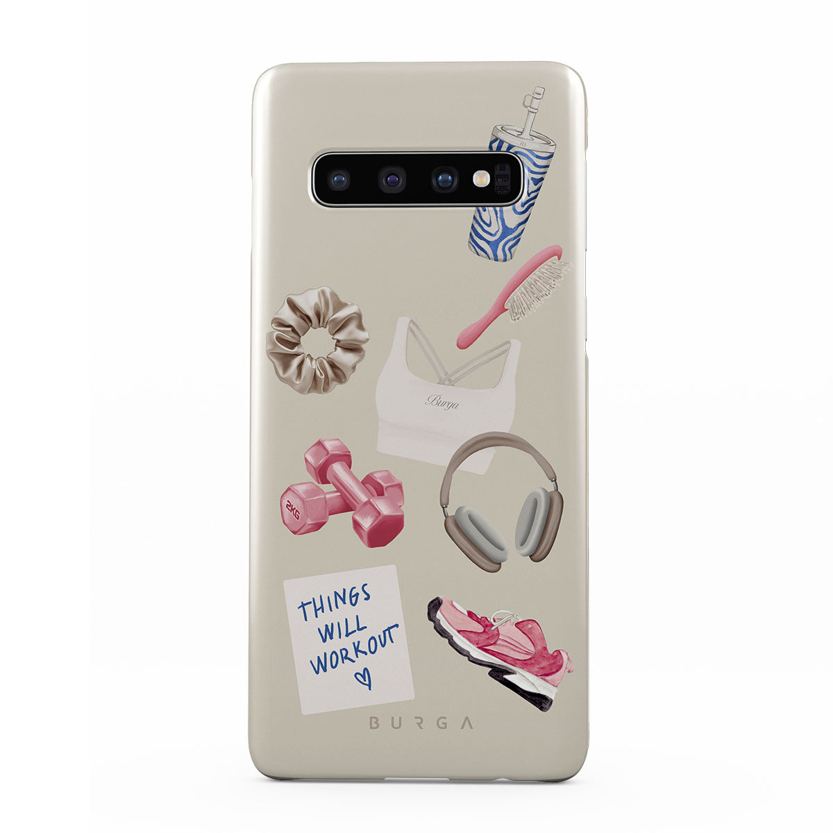 Questo design include: manubri, cuffie, borraccia, spazzola per capelli, scarpe da ginnastica rosa, top sportivo, barretta Crunchie, post-it "Things Will Work Out".