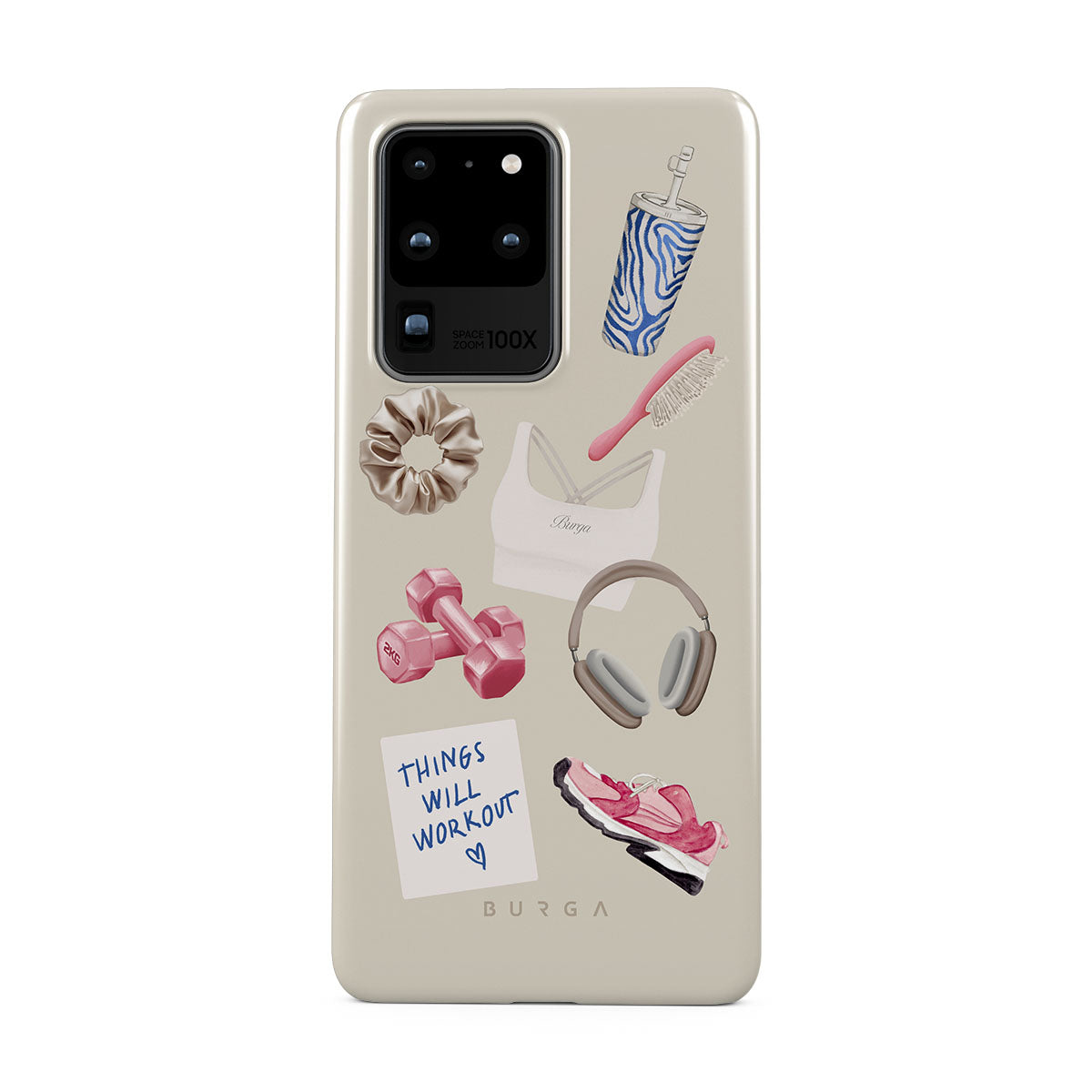 Questo design include: manubri, cuffie, borraccia, spazzola per capelli, scarpe da ginnastica rosa, top sportivo, barretta Crunchie, post-it "Things Will Work Out".