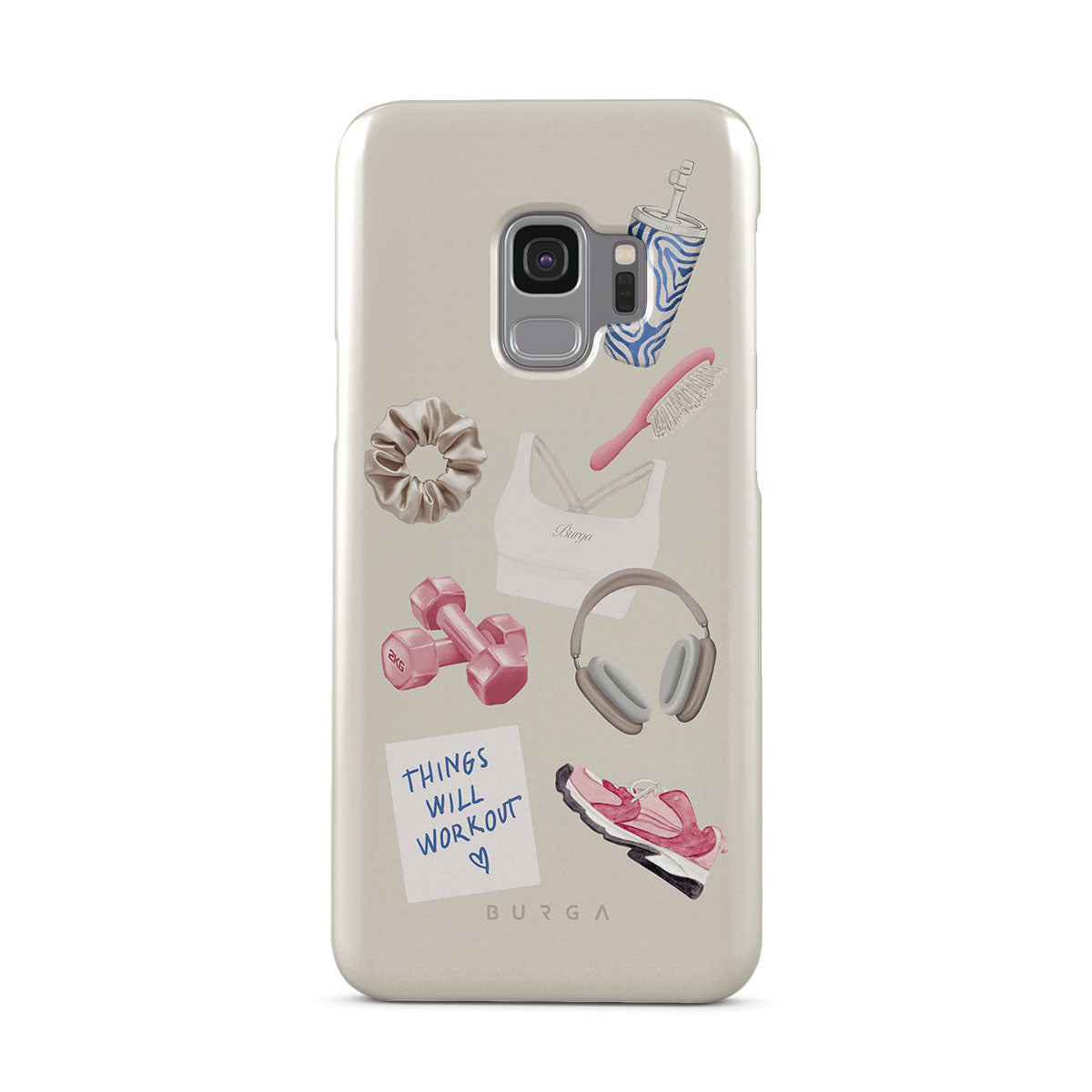 Questo design include: manubri, cuffie, borraccia, spazzola per capelli, scarpe da ginnastica rosa, top sportivo, barretta Crunchie, post-it "Things Will Work Out".