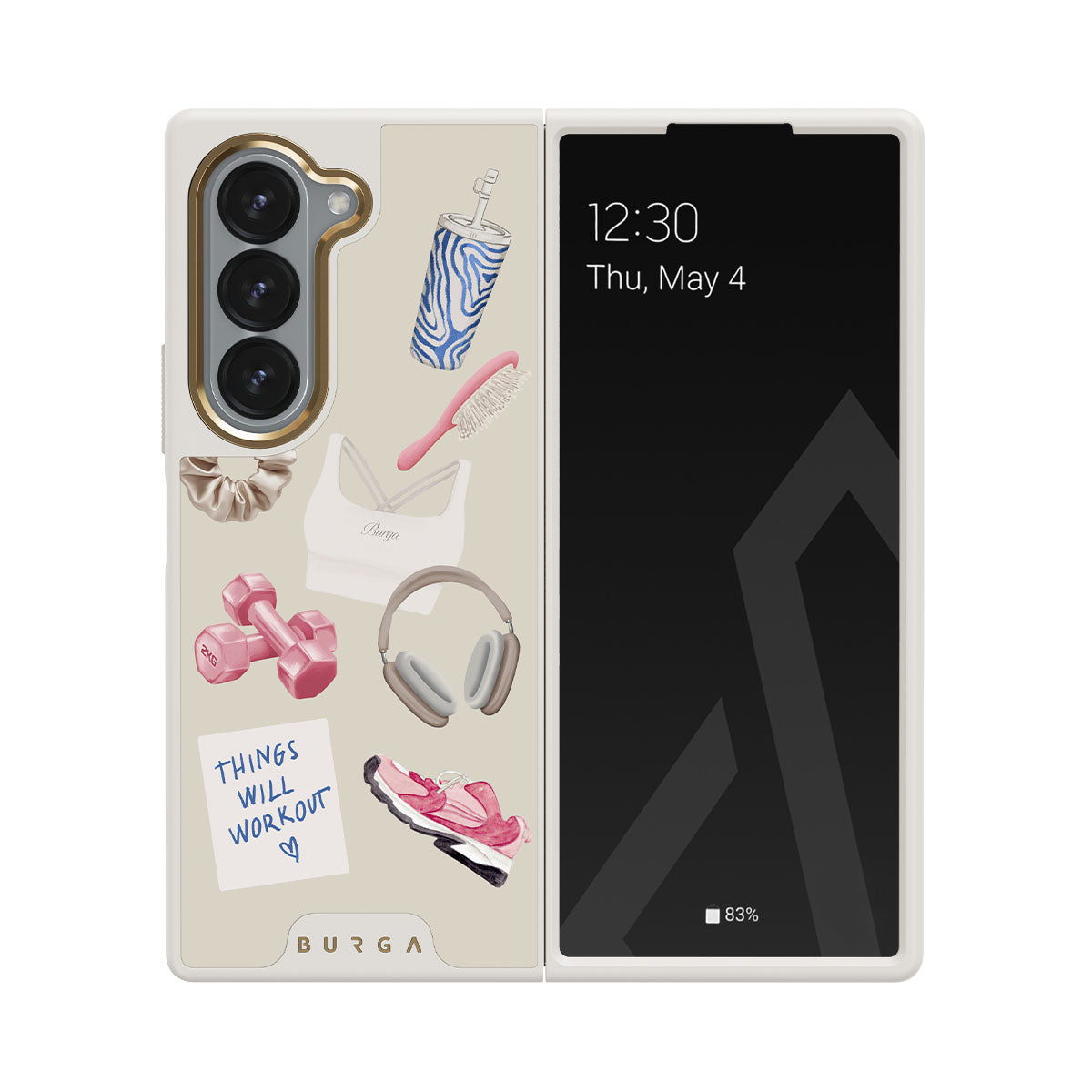 Questo design include: manubri, cuffie, borraccia, spazzola per capelli, scarpe da ginnastica rosa, top sportivo, barretta Crunchie, post-it "Things Will Work Out".