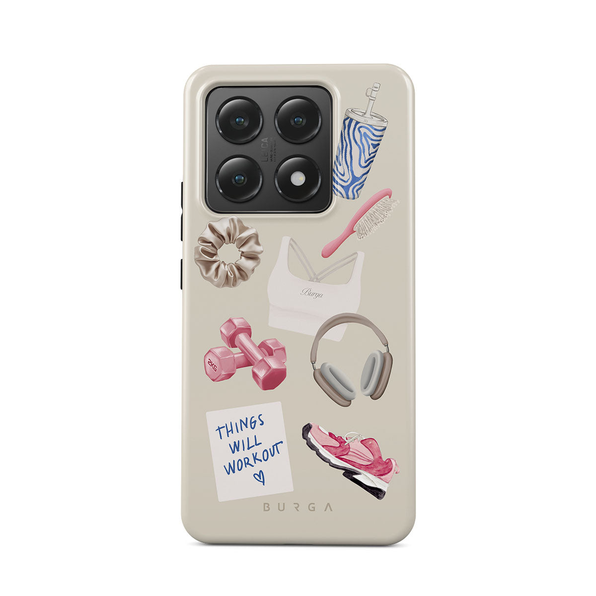 Questo design include: manubri, cuffie, borraccia, spazzola per capelli, scarpe da ginnastica rosa, top sportivo, barretta Crunchie, post-it "Things Will Work Out".