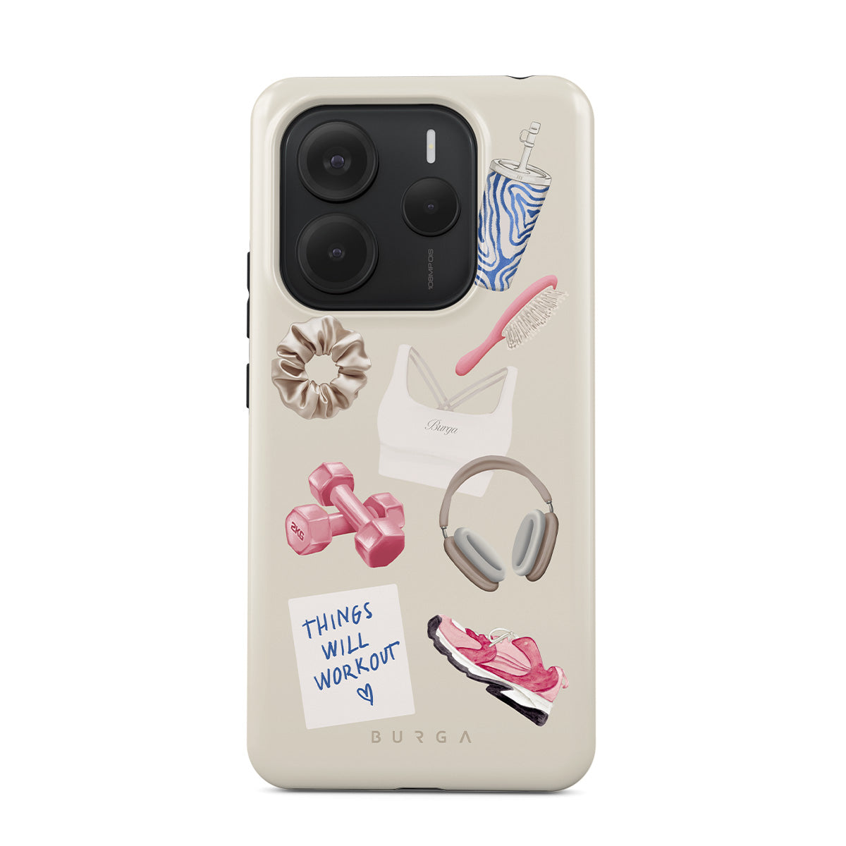 Questo design include: manubri, cuffie, borraccia, spazzola per capelli, scarpe da ginnastica rosa, top sportivo, barretta Crunchie, post-it "Things Will Work Out".