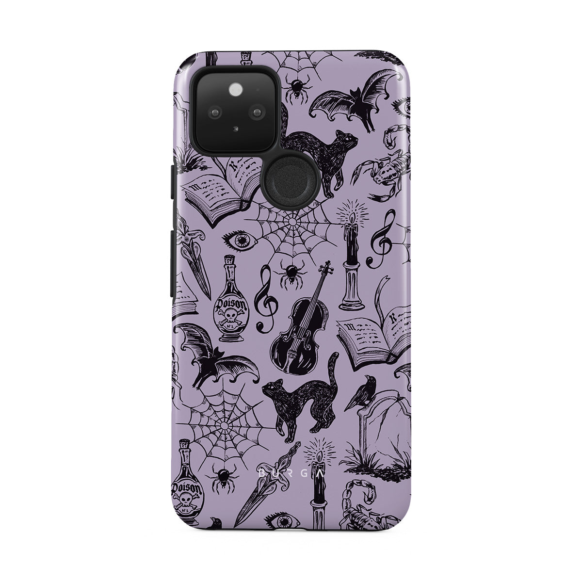 Questo design include: scarabocchi gotici, elementi misteriosi, ragni, ragnatele, gatto, violino, occhio, candela, pugnale, libro, pipistrello, corvo, scorpione