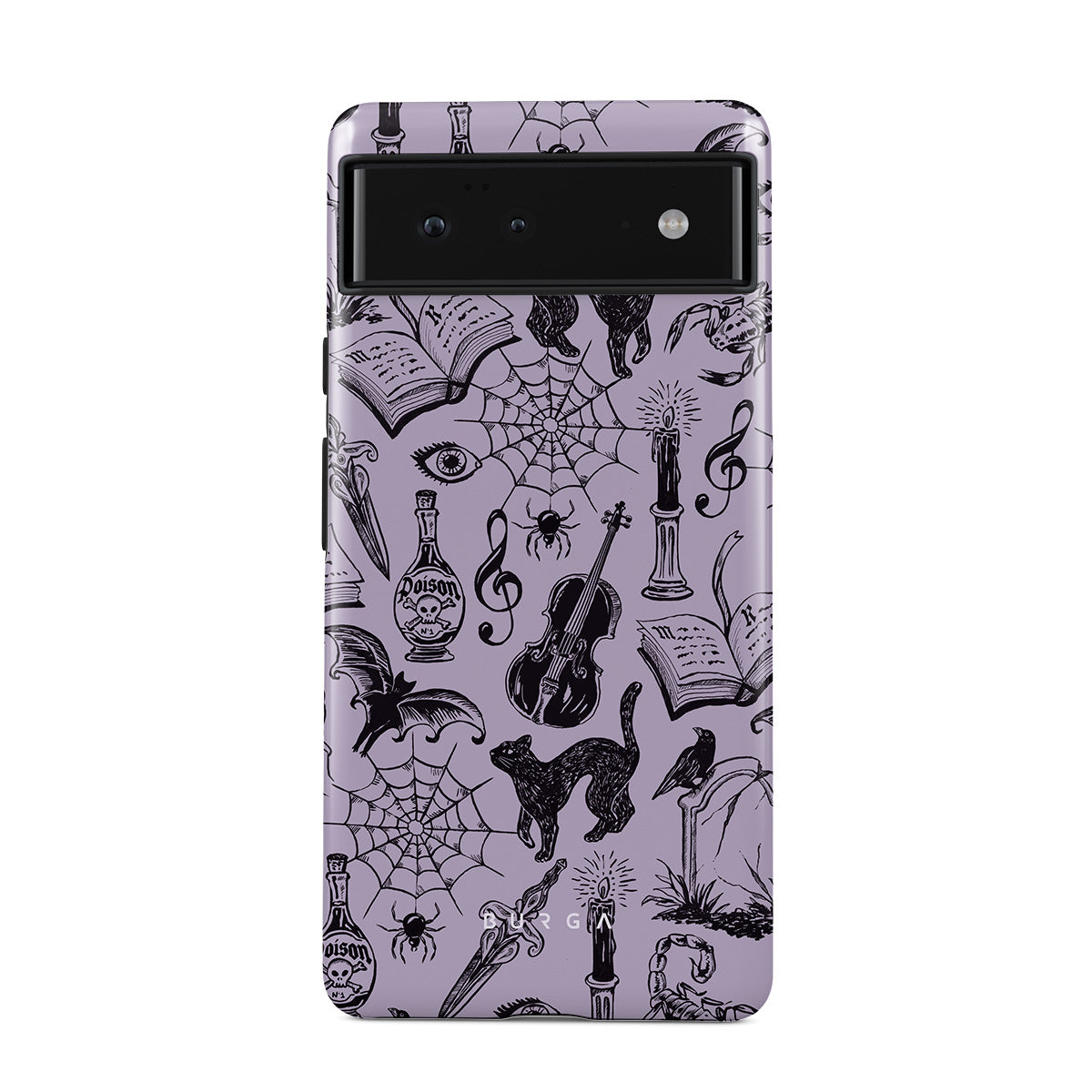 Questo design include: scarabocchi gotici, elementi misteriosi, ragni, ragnatele, gatto, violino, occhio, candela, pugnale, libro, pipistrello, corvo, scorpione
