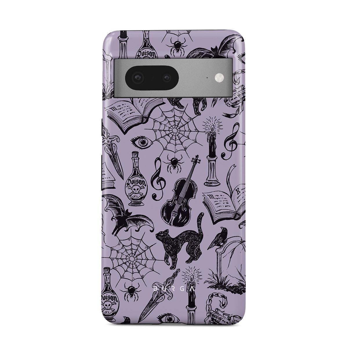 Questo design include: scarabocchi gotici, elementi misteriosi, ragni, ragnatele, gatto, violino, occhio, candela, pugnale, libro, pipistrello, corvo, scorpione