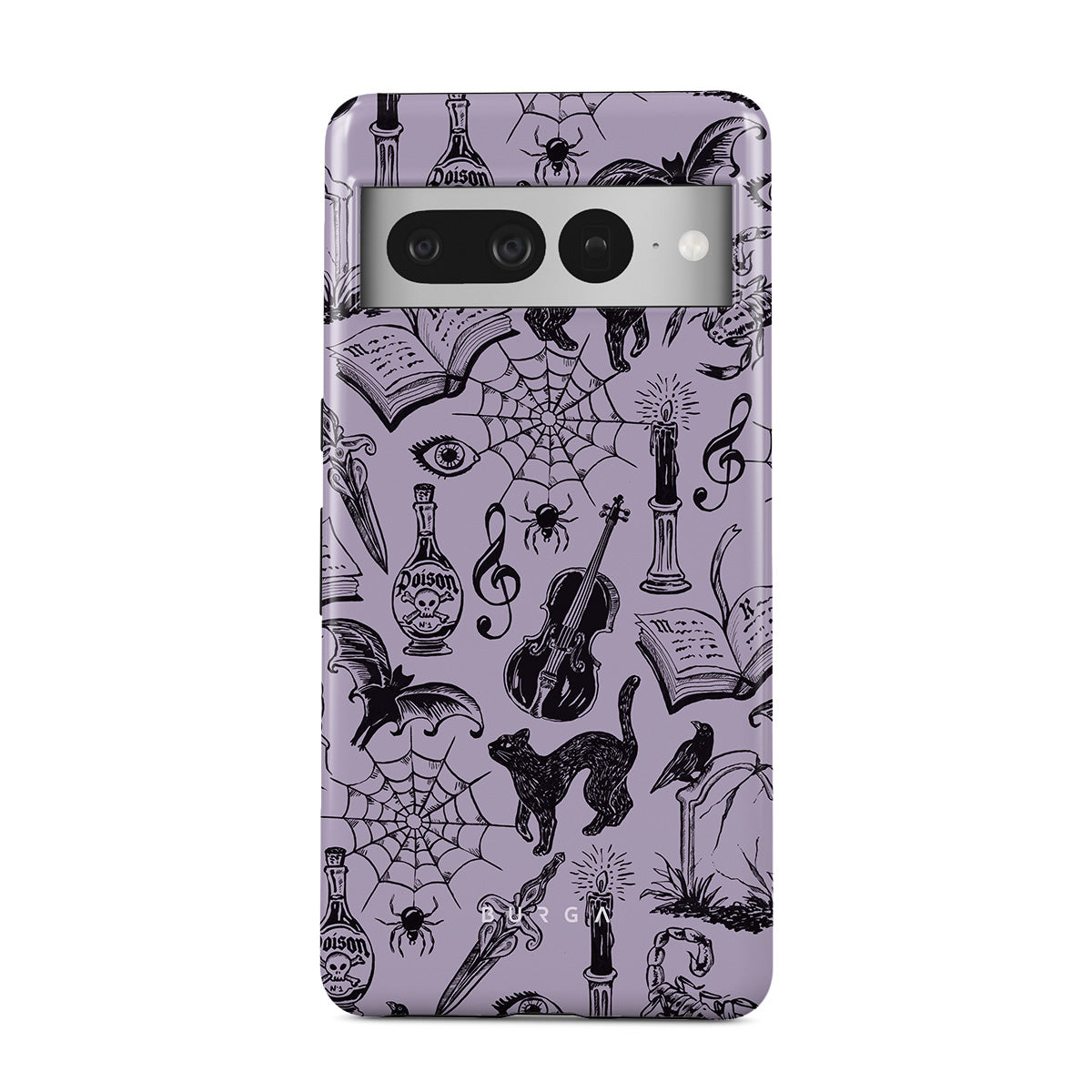 Questo design include: scarabocchi gotici, elementi misteriosi, ragni, ragnatele, gatto, violino, occhio, candela, pugnale, libro, pipistrello, corvo, scorpione