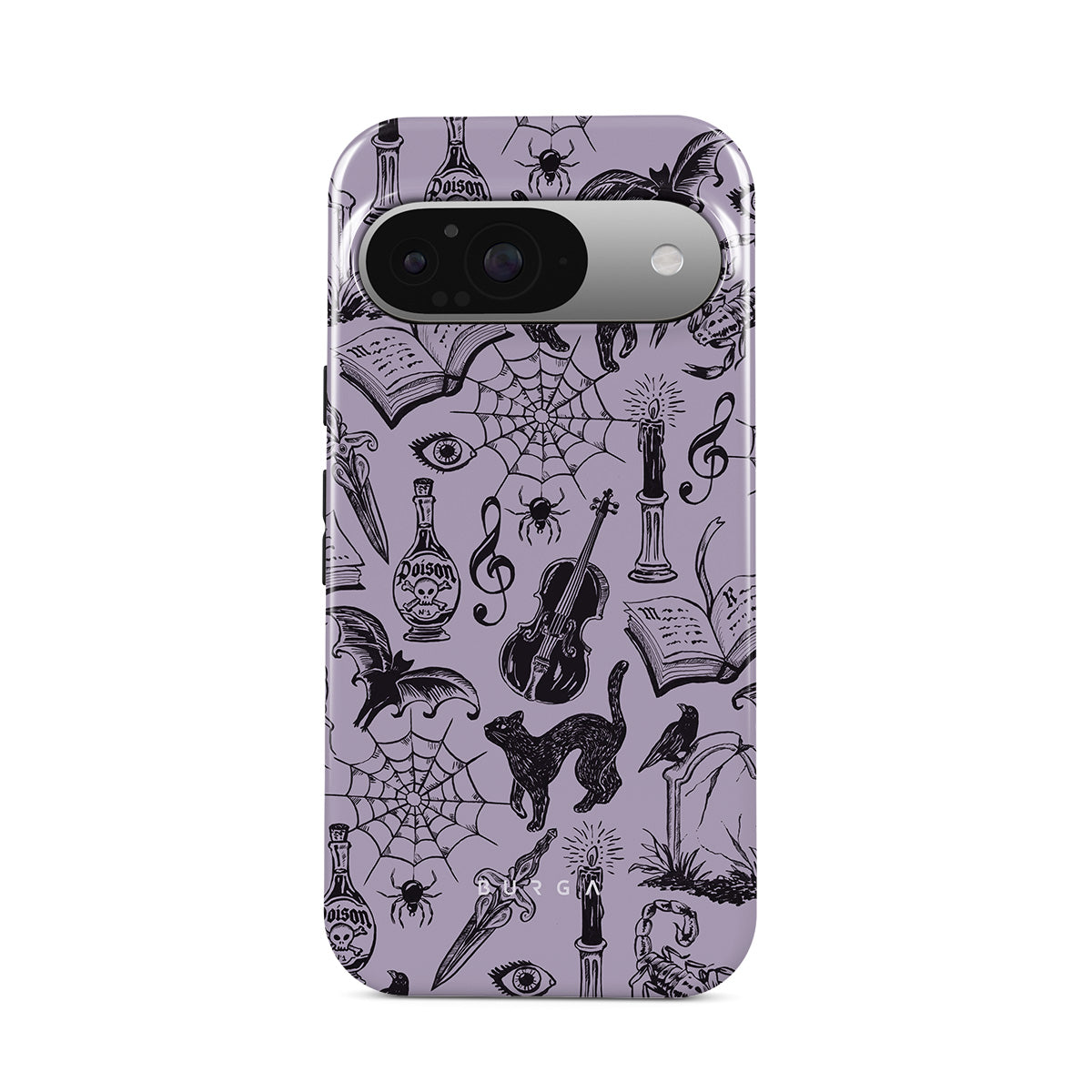 Questo design include: scarabocchi gotici, elementi misteriosi, ragni, ragnatele, gatto, violino, occhio, candela, pugnale, libro, pipistrello, corvo, scorpione