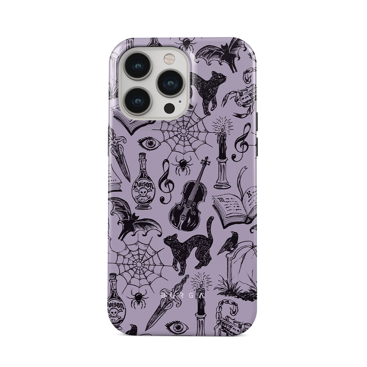 Questo design include: scarabocchi gotici, elementi misteriosi, ragni, ragnatele, gatto, violino, occhio, candela, pugnale, libro, pipistrello, corvo, scorpione