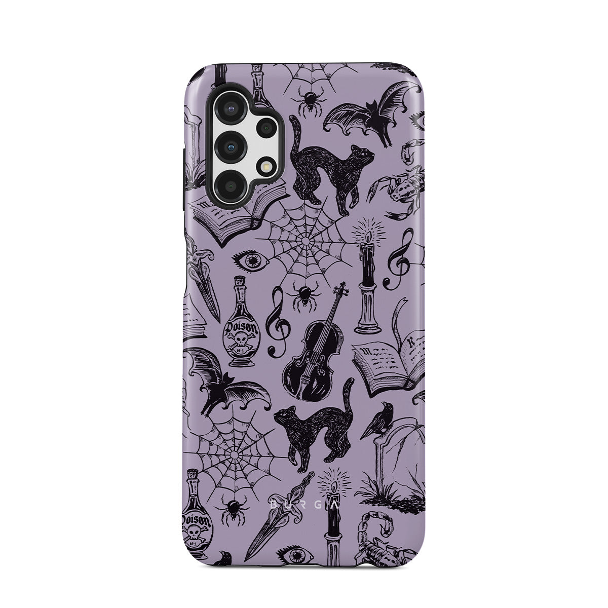 Questo design include: scarabocchi gotici, elementi misteriosi, ragni, ragnatele, gatto, violino, occhio, candela, pugnale, libro, pipistrello, corvo, scorpione