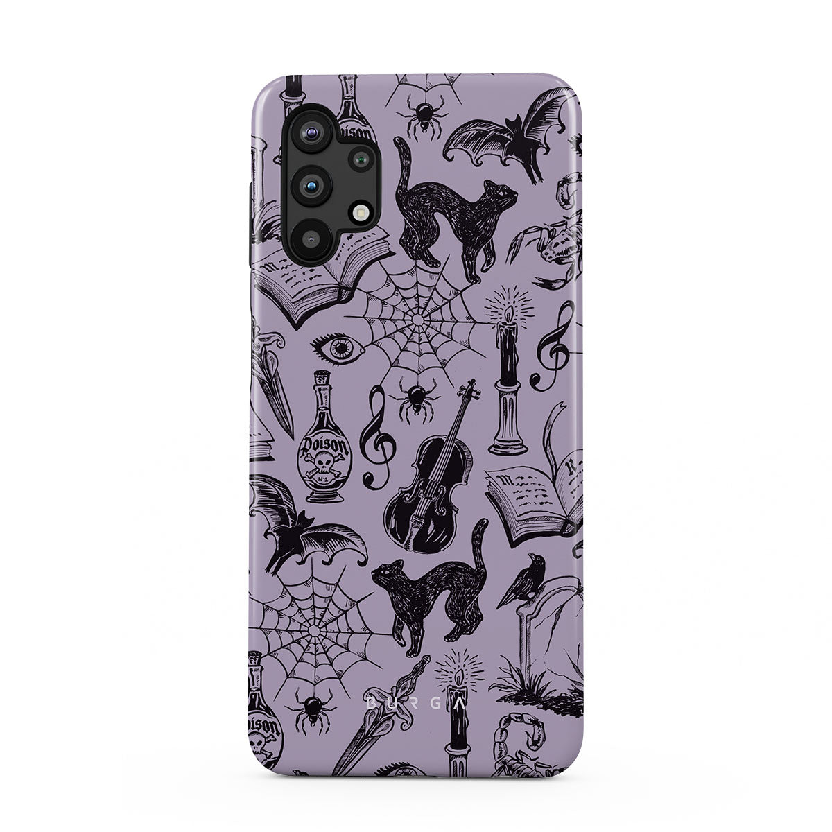 Questo design include: scarabocchi gotici, elementi misteriosi, ragni, ragnatele, gatto, violino, occhio, candela, pugnale, libro, pipistrello, corvo, scorpione