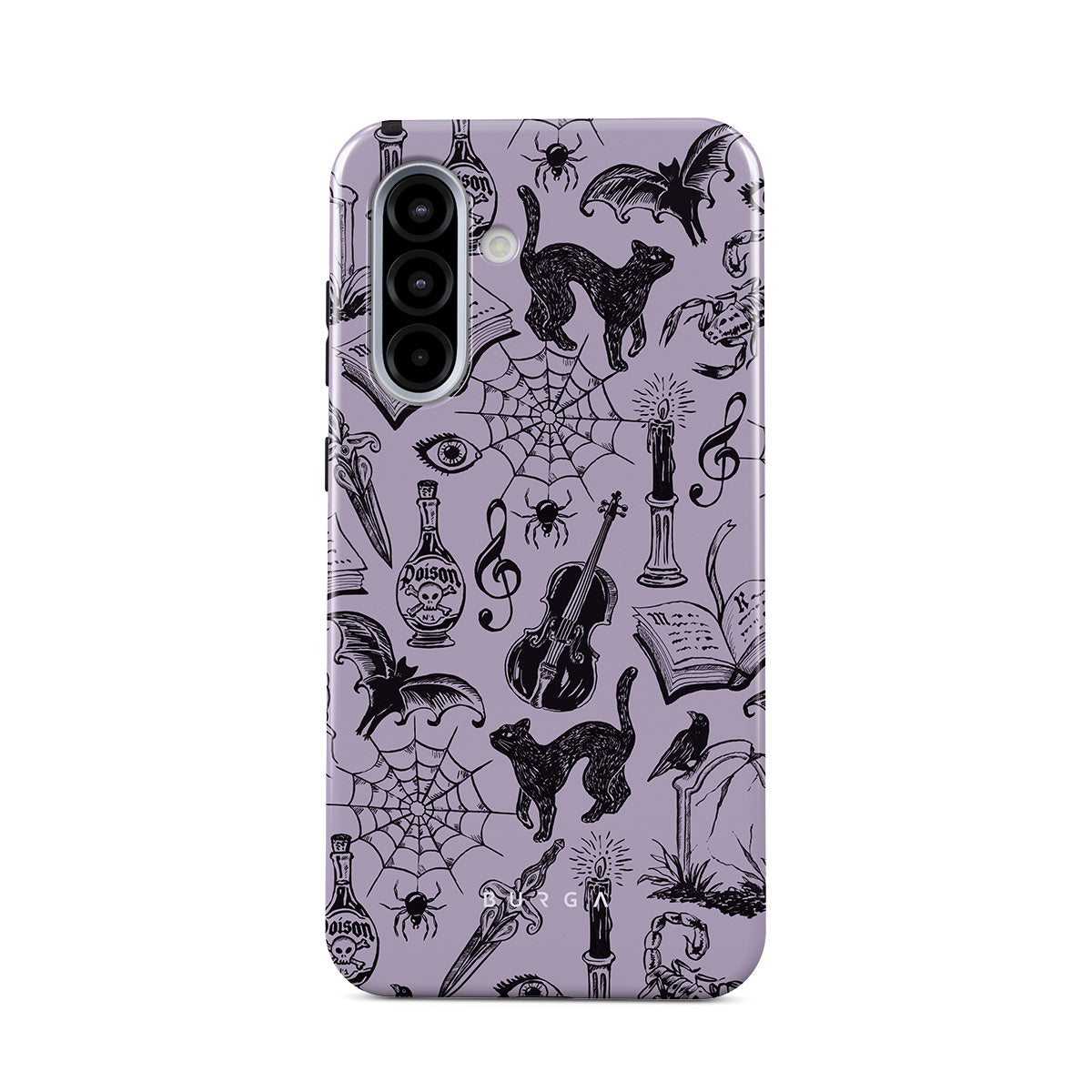 Questo design include: scarabocchi gotici, elementi misteriosi, ragni, ragnatele, gatto, violino, occhio, candela, pugnale, libro, pipistrello, corvo, scorpione