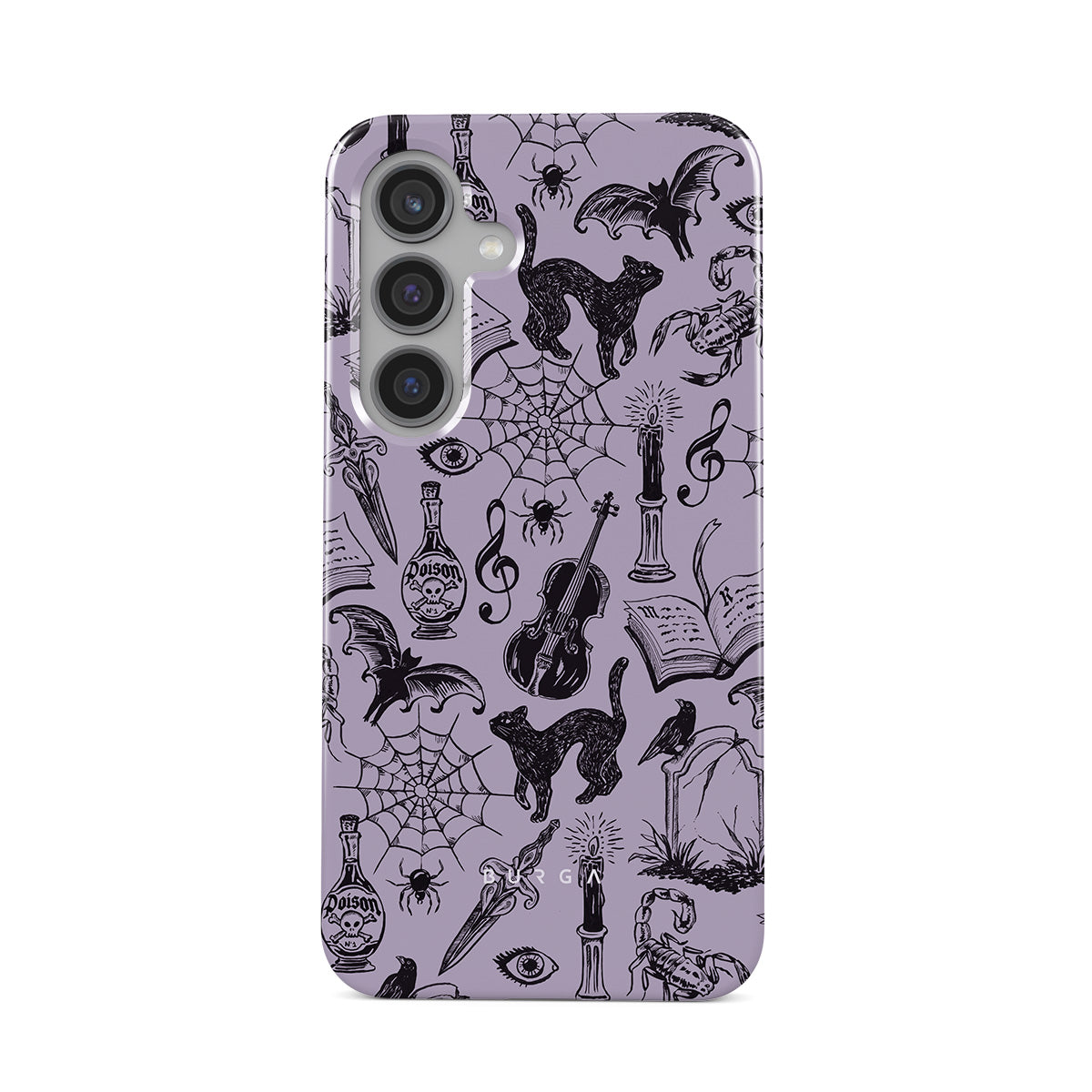 Questo design include: scarabocchi gotici, elementi misteriosi, ragni, ragnatele, gatto, violino, occhio, candela, pugnale, libro, pipistrello, corvo, scorpione