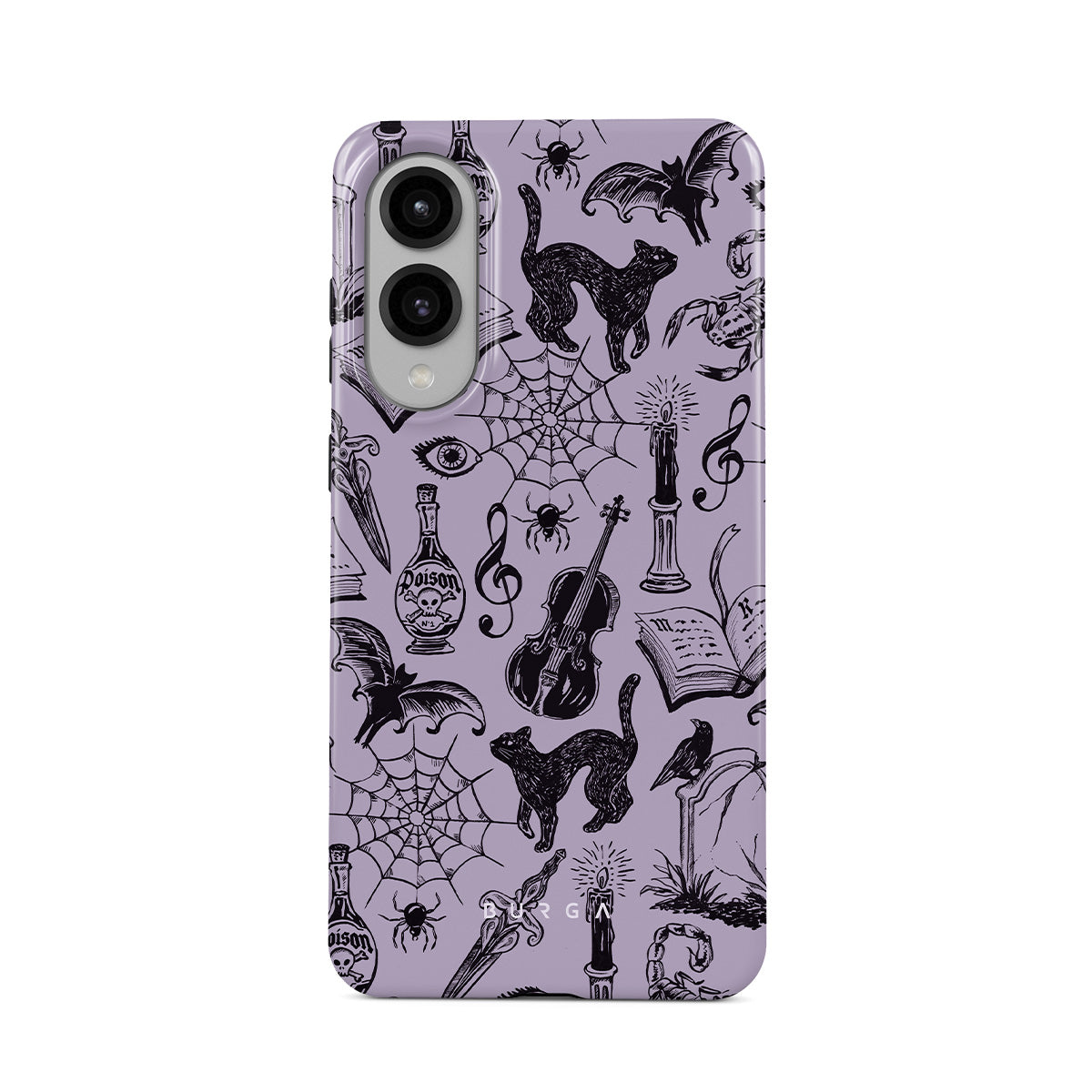 Questo design include: scarabocchi gotici, elementi misteriosi, ragni, ragnatele, gatto, violino, occhio, candela, pugnale, libro, pipistrello, corvo, scorpione