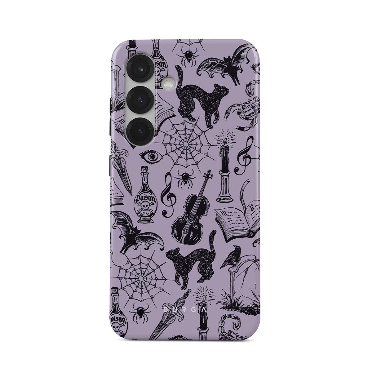 Questo design include: scarabocchi gotici, elementi misteriosi, ragni, ragnatele, gatto, violino, occhio, candela, pugnale, libro, pipistrello, corvo, scorpione
