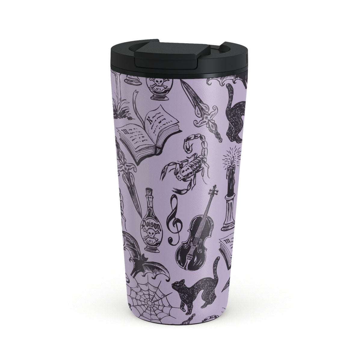 Questo design include: scarabocchi gotici, elementi misteriosi, ragni, ragnatele, gatto, violino, occhio, candela, pugnale, libro, pipistrello, corvo, scorpione
