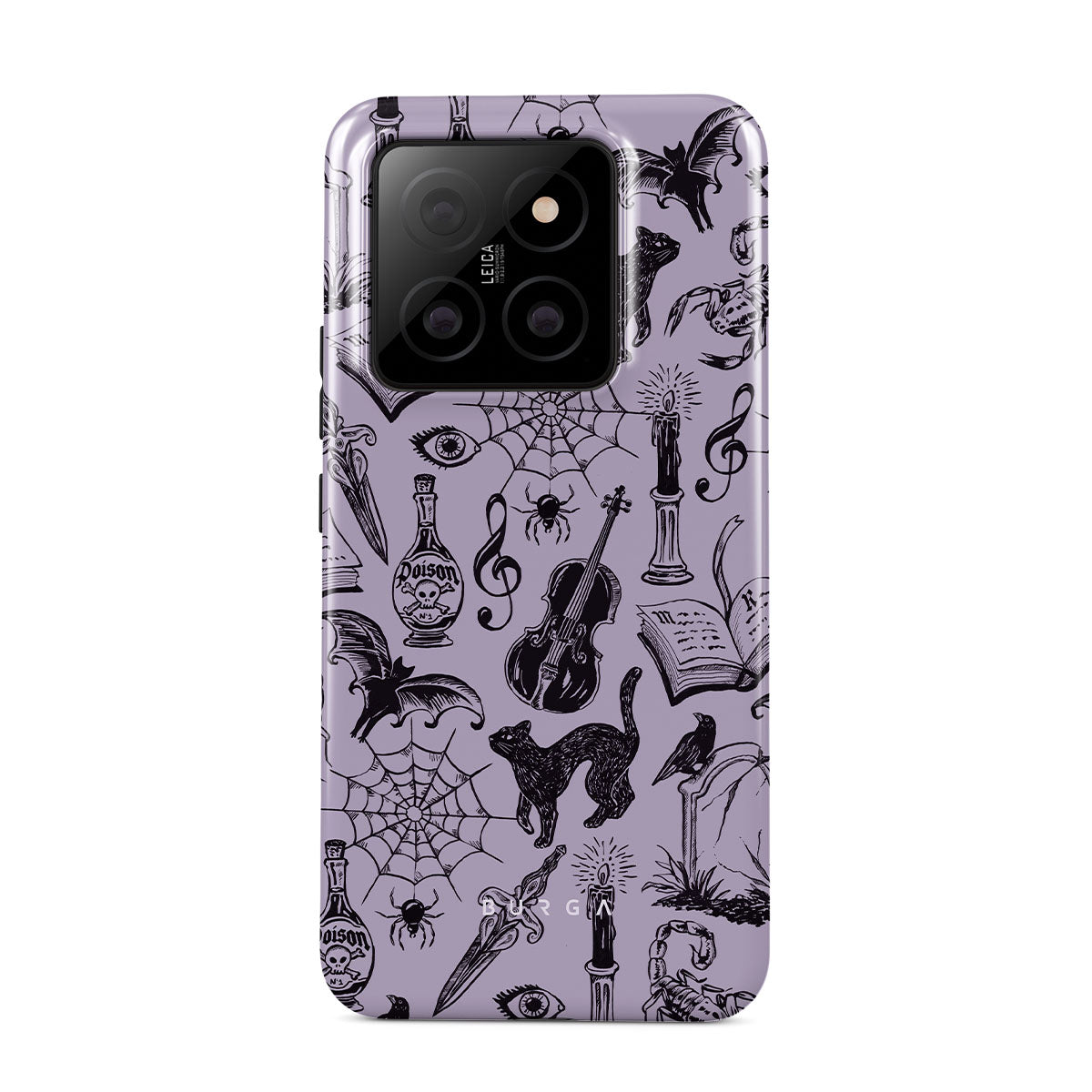Questo design include: scarabocchi gotici, elementi misteriosi, ragni, ragnatele, gatto, violino, occhio, candela, pugnale, libro, pipistrello, corvo, scorpione