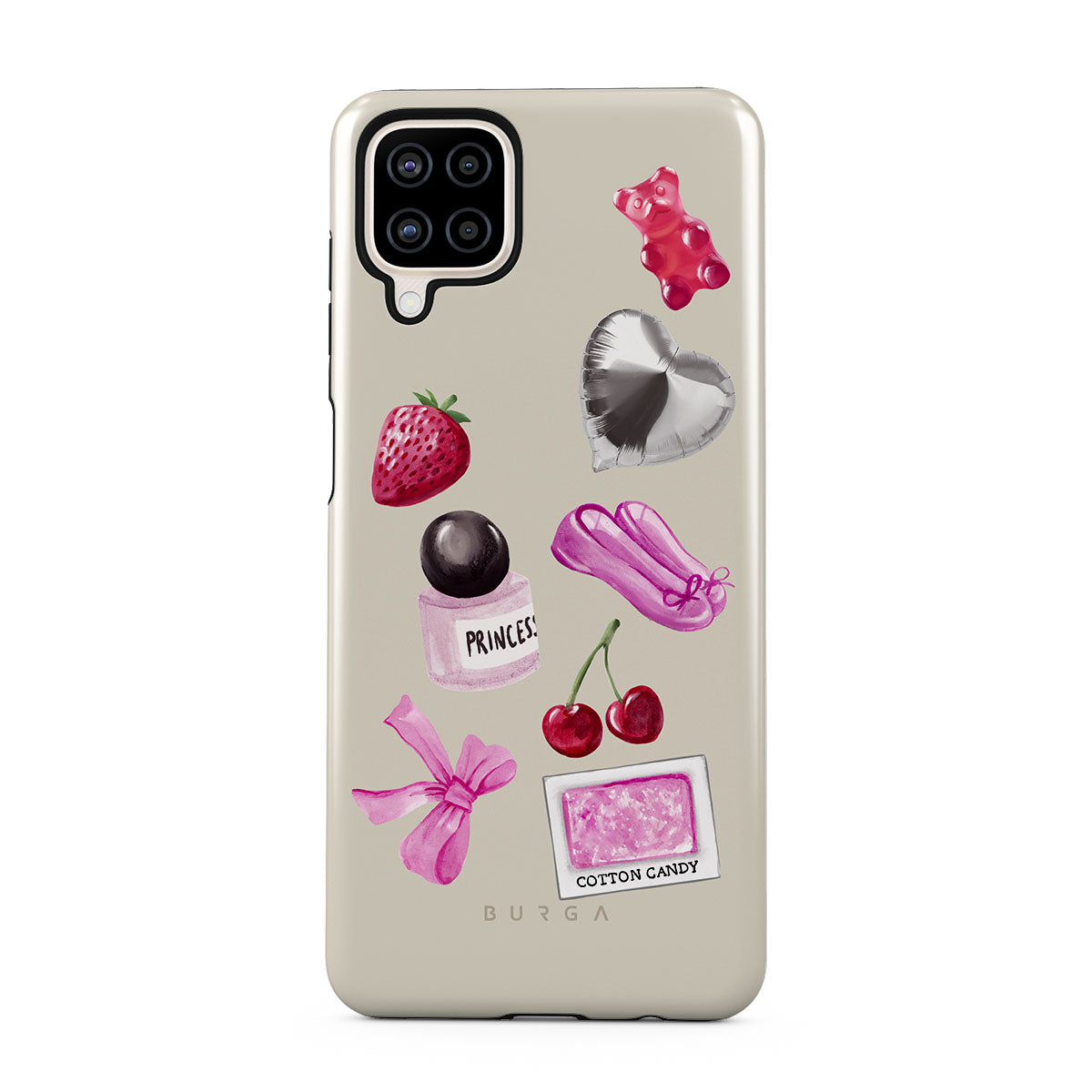 Questo design include: fiocco rosa, palloncino argentato a forma di cuore, bottiglia di profumo, fragola, ciliegie, scarpette da balletto rosa, sticker zucchero filato, orsetto gommoso rosa.