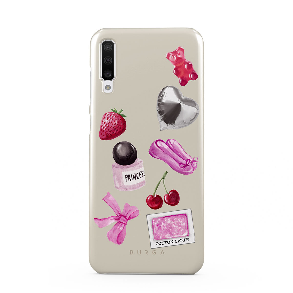 Questo design include: fiocco rosa, palloncino argentato a forma di cuore, bottiglia di profumo, fragola, ciliegie, scarpette da balletto rosa, sticker zucchero filato, orsetto gommoso rosa.