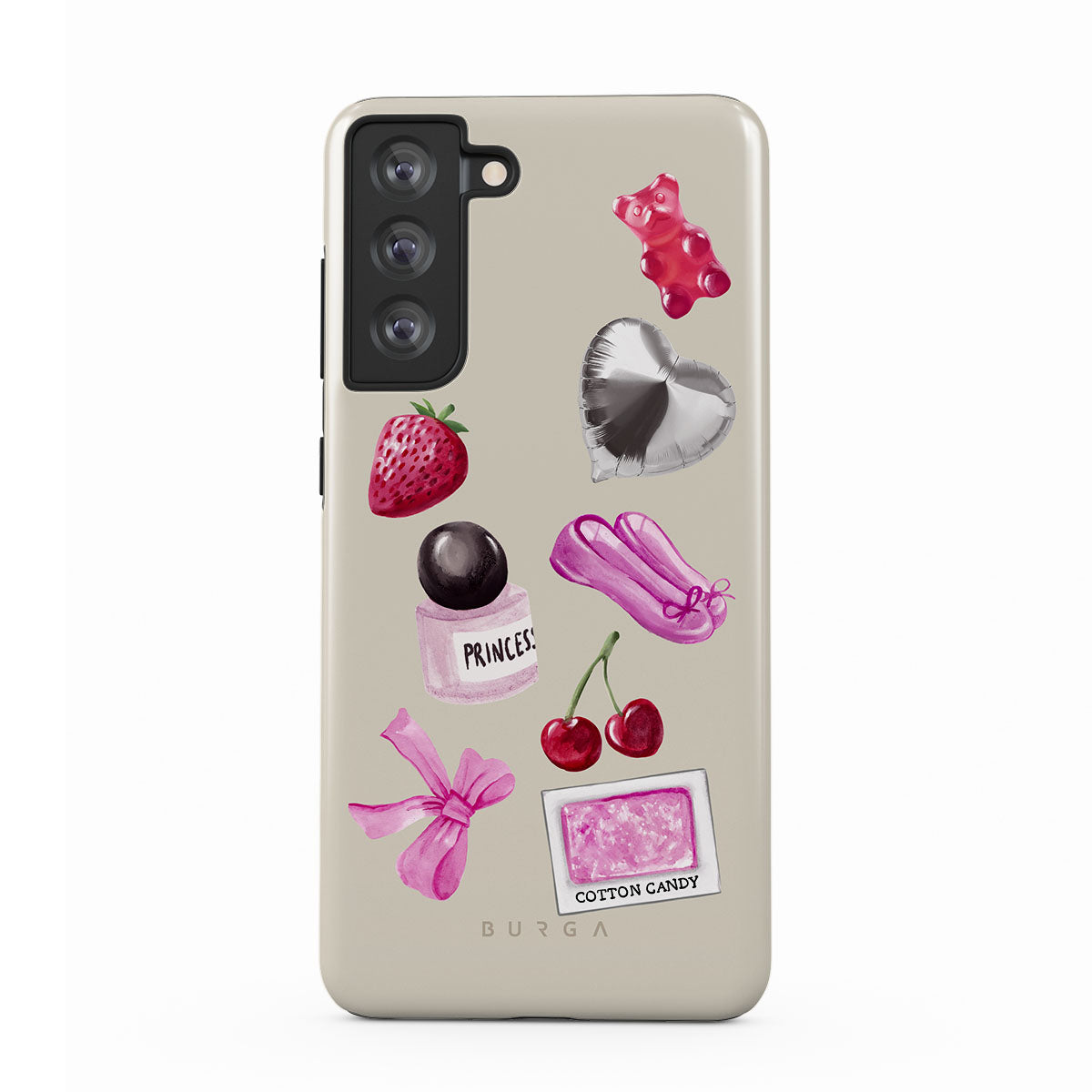 Questo design include: fiocco rosa, palloncino argentato a forma di cuore, bottiglia di profumo, fragola, ciliegie, scarpette da balletto rosa, sticker zucchero filato, orsetto gommoso rosa.