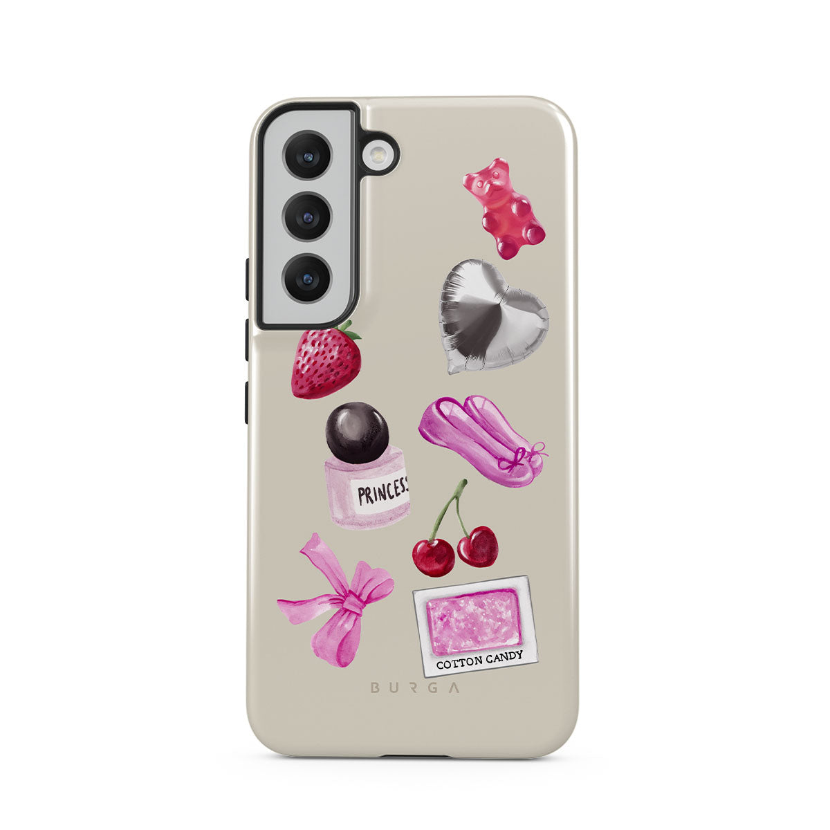 Questo design include: fiocco rosa, palloncino argentato a forma di cuore, bottiglia di profumo, fragola, ciliegie, scarpette da balletto rosa, sticker zucchero filato, orsetto gommoso rosa.