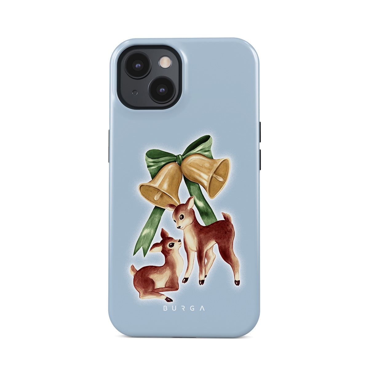 Questo design include: renna vintage, campane di Natale, campane dorate, illustrazione retro di renna, cerbiatto, sfondo azzurro chiaro