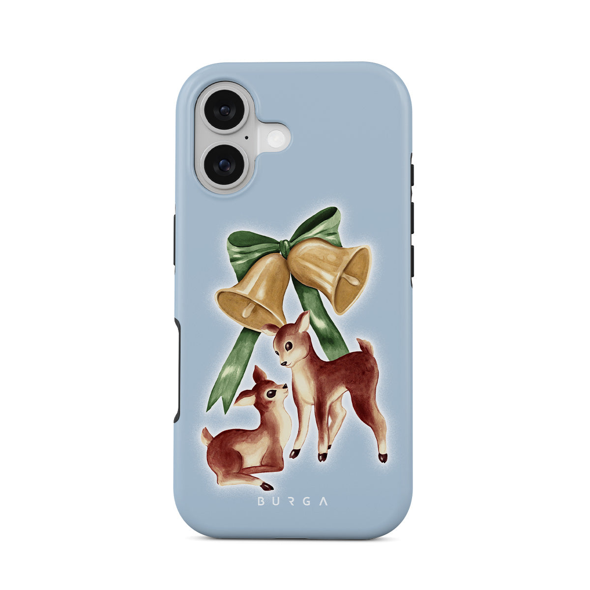 Questo design include: renna vintage, campane di Natale, campane dorate, illustrazione retro di renna, cerbiatto, sfondo azzurro chiaro