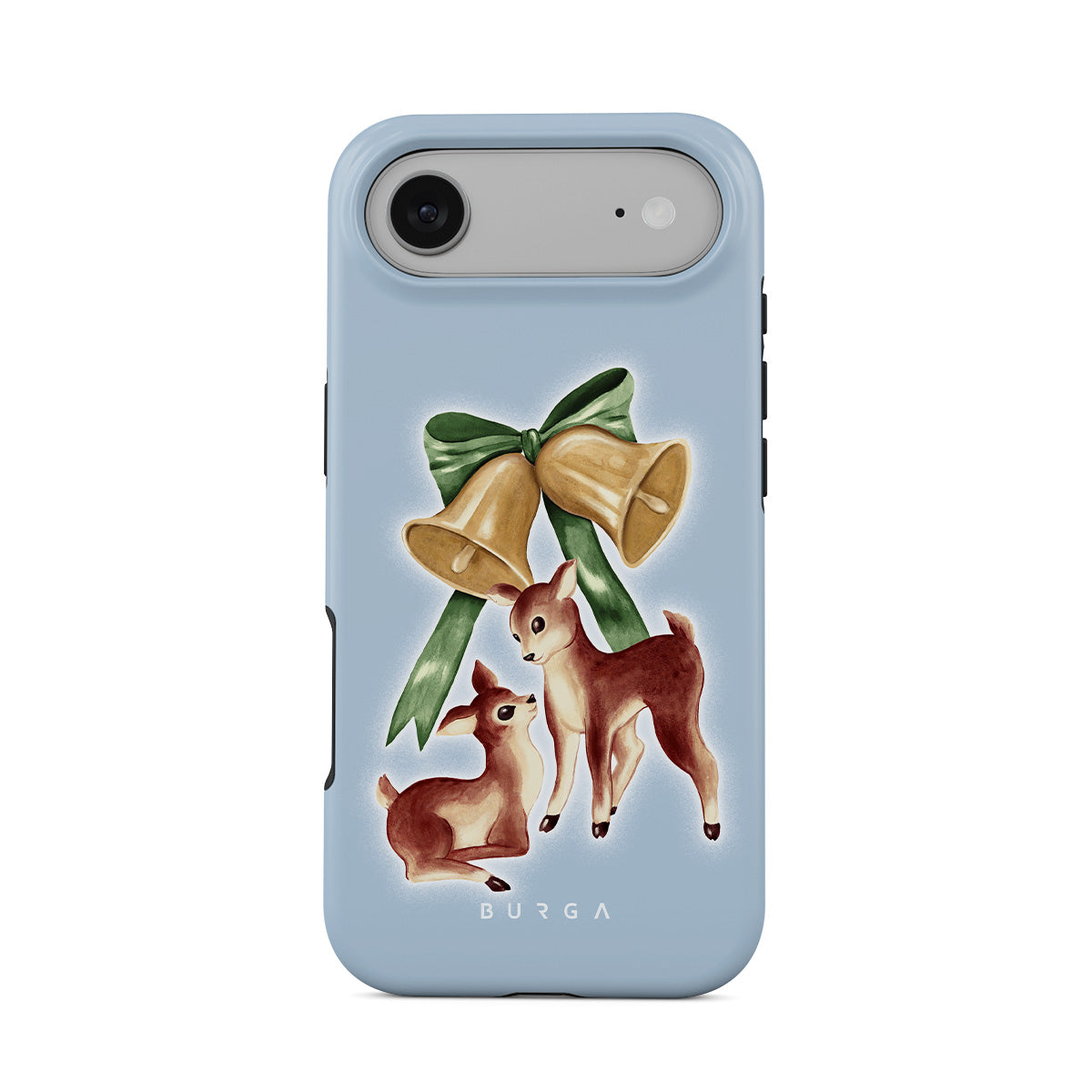 Questo design include: renna vintage, campane di Natale, campane dorate, illustrazione retro di renna, cerbiatto, sfondo azzurro chiaro
