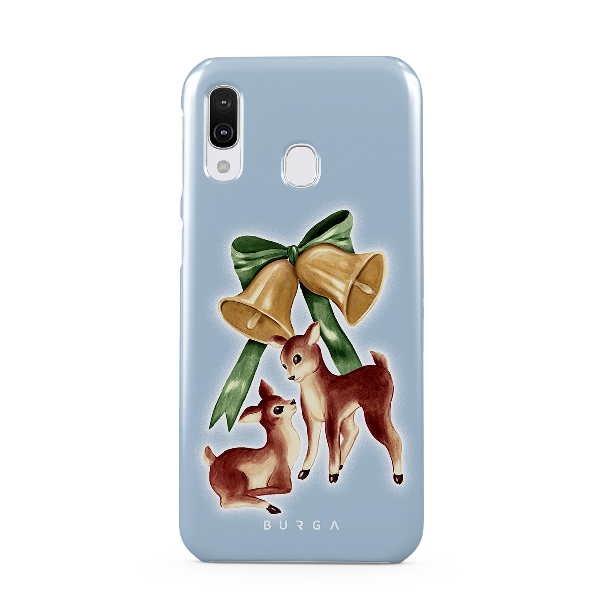 Questo design include: renna vintage, campane di Natale, campane dorate, illustrazione retro di renna, cerbiatto, sfondo azzurro chiaro