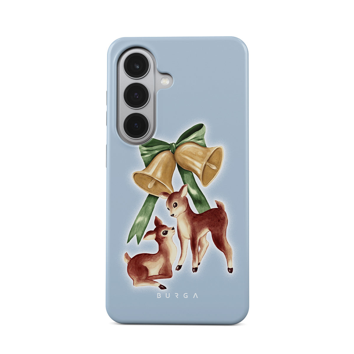 Questo design include: renna vintage, campane di Natale, campane dorate, illustrazione retro di renna, cerbiatto, sfondo azzurro chiaro
