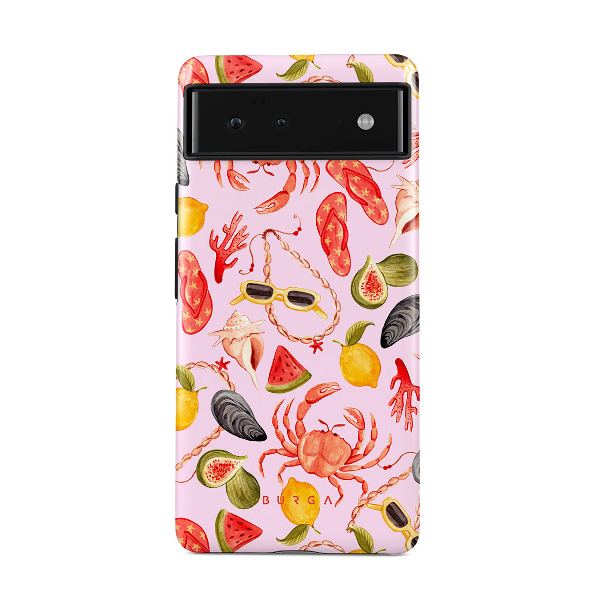 Questo design include: anguria, occhiali da sole, frutti di mare, granchio, infradito, ostriche, limone, colori vivaci, tema tropicale