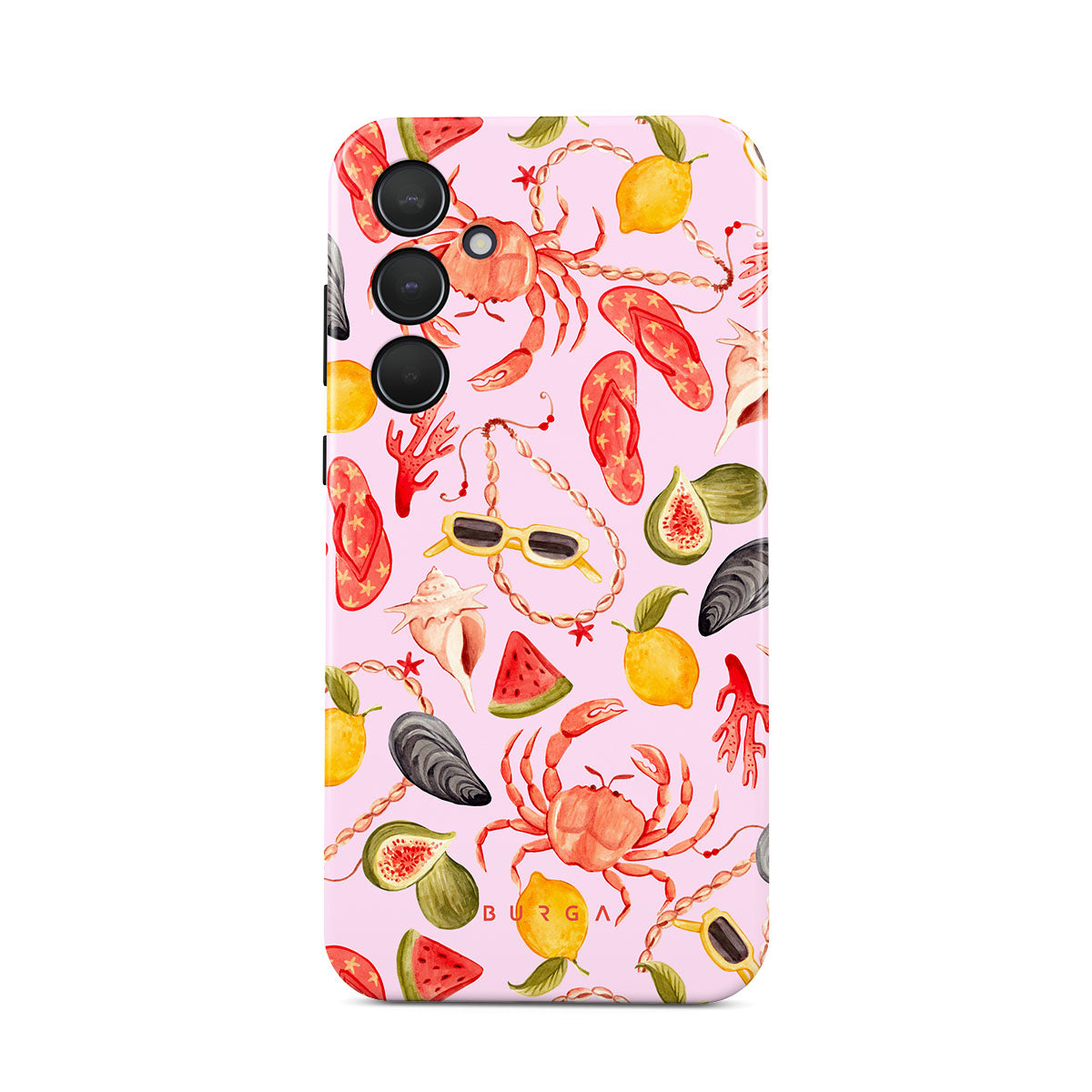 Questo design include: anguria, occhiali da sole, frutti di mare, granchio, infradito, ostriche, limone, colori vivaci, tema tropicale