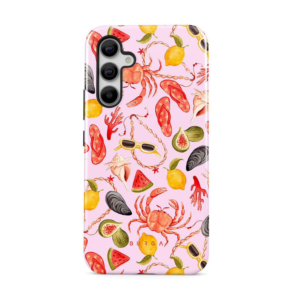 Questo design include: anguria, occhiali da sole, frutti di mare, granchio, infradito, ostriche, limone, colori vivaci, tema tropicale
