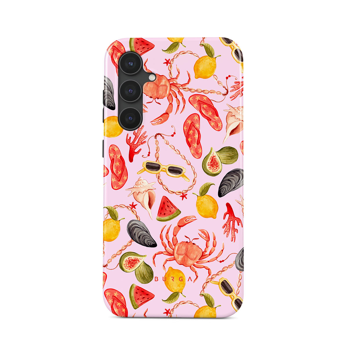 Questo design include: anguria, occhiali da sole, frutti di mare, granchio, infradito, ostriche, limone, colori vivaci, tema tropicale