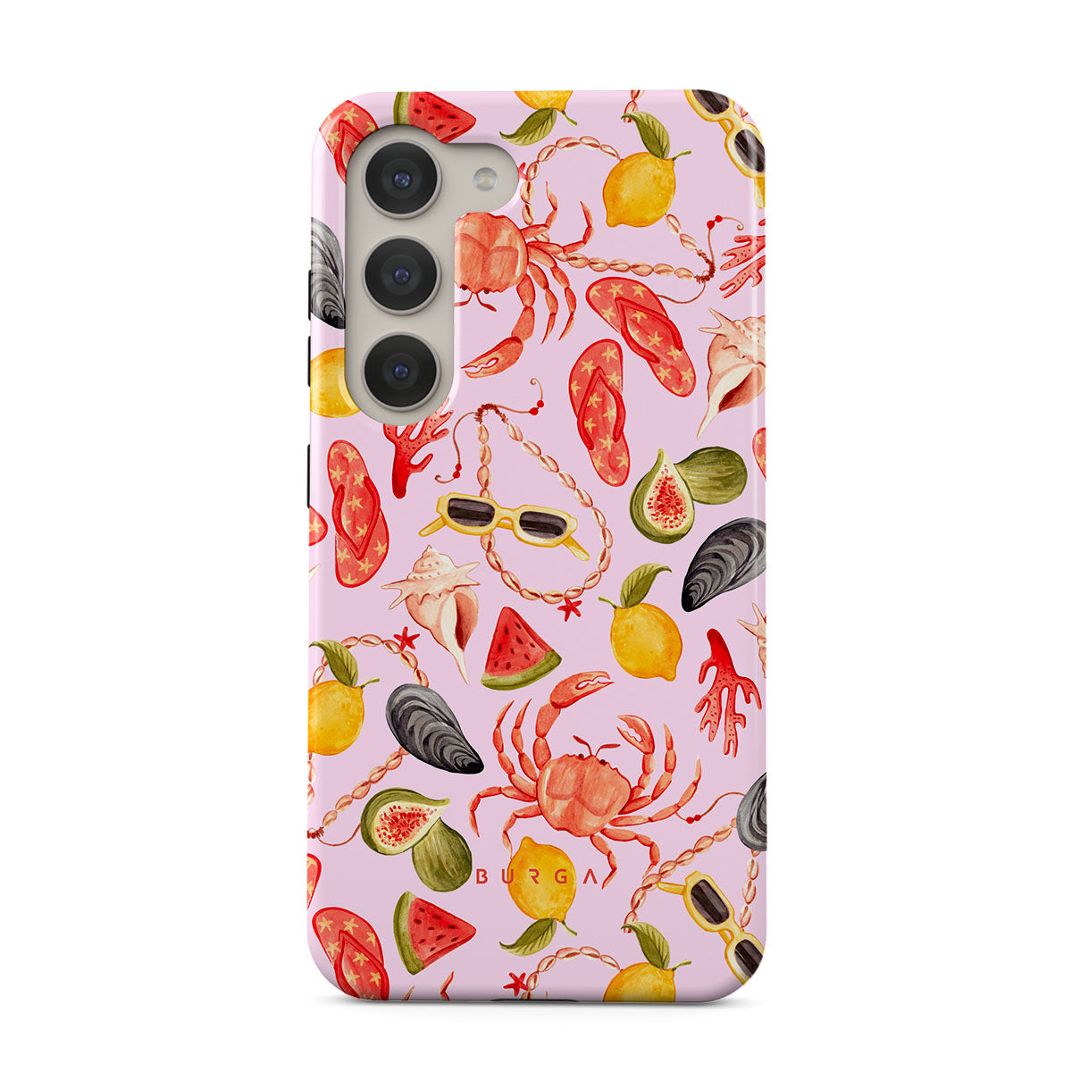 Questo design include: anguria, occhiali da sole, frutti di mare, granchio, infradito, ostriche, limone, colori vivaci, tema tropicale